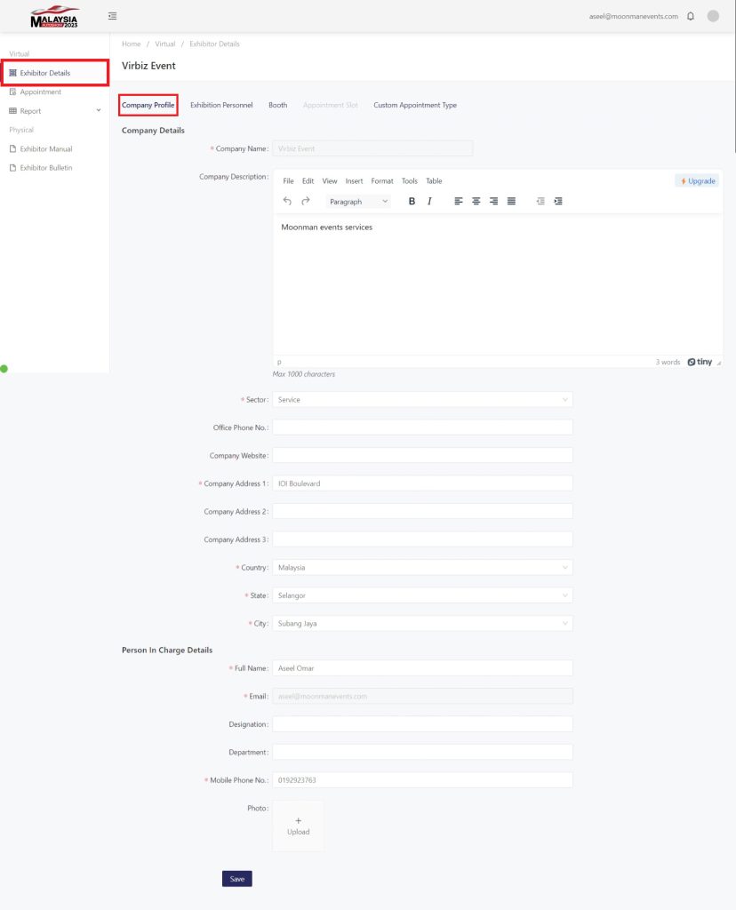 COMPANY PROFILE – section if for exhibitors details. Only Company Name will be displayed on the visitor portal.