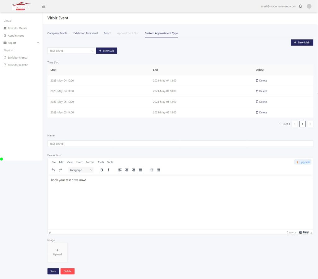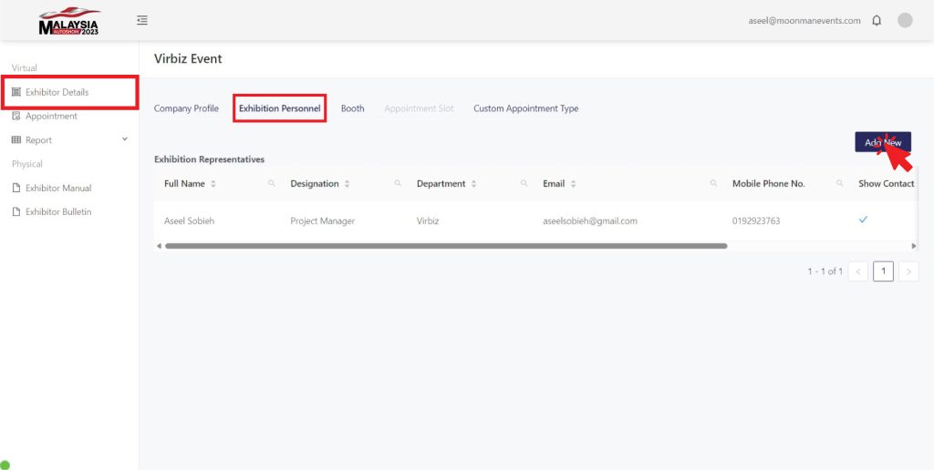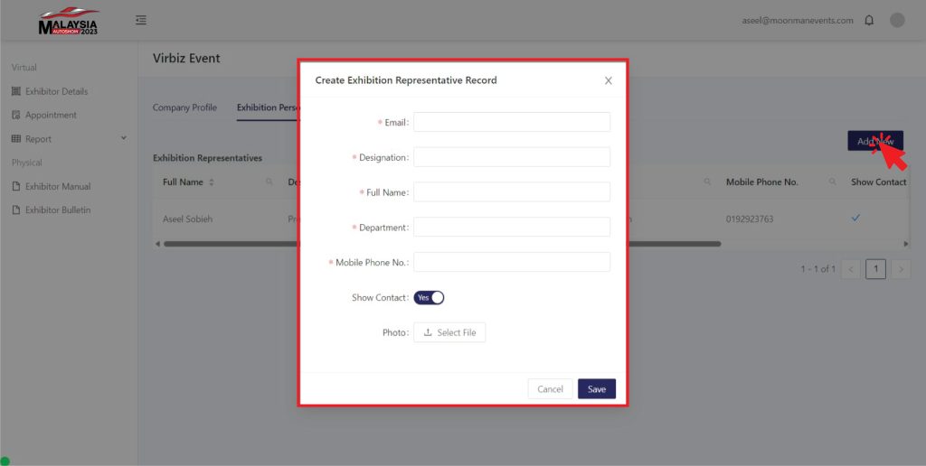 ADD NEW & EDIT – Super admin can add in all the exhibitor personnel and all accounts created will get their own login account. All booth reps must upload their photos for entry at the venue. Exhibitor has the option to show contact or not.