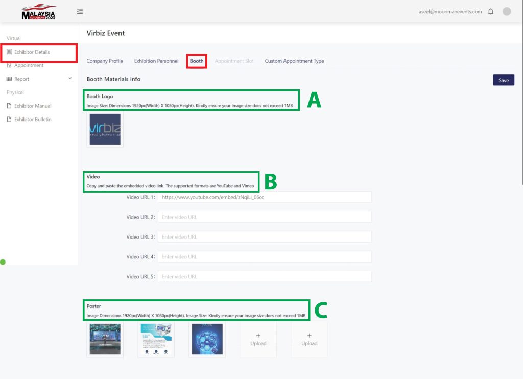 BOOTH – In the booth section you will be able to upload your company logo, 5 videos, and 5 posters. Dimensions and file size details are above the upload section.