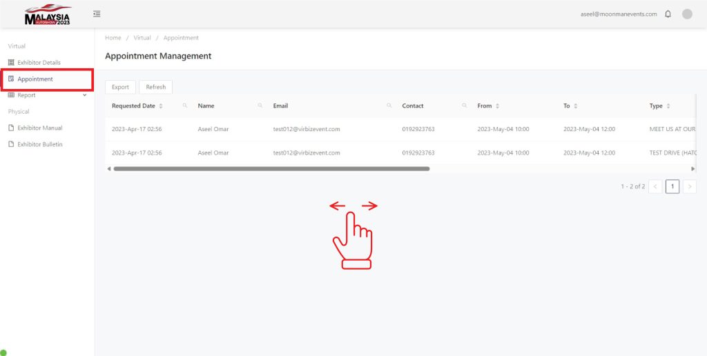 In this section exhibitor can view who has requested appointment and the type of appointment.
