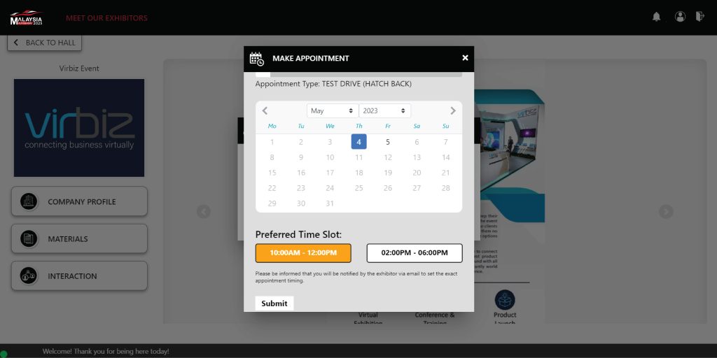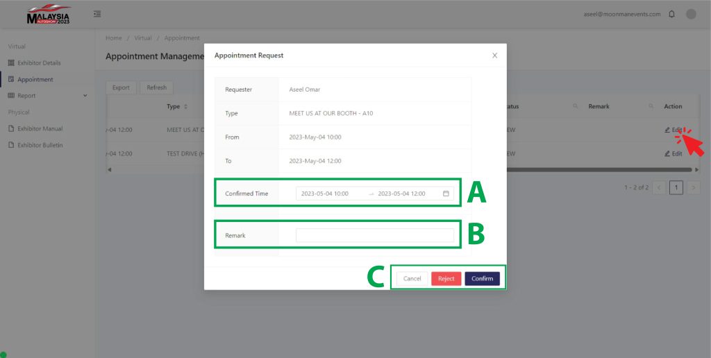A – Exhibitor is able to adjust the time and send back to the visitor. Visitors will receive an email notification if you have approved with the updated date and time.